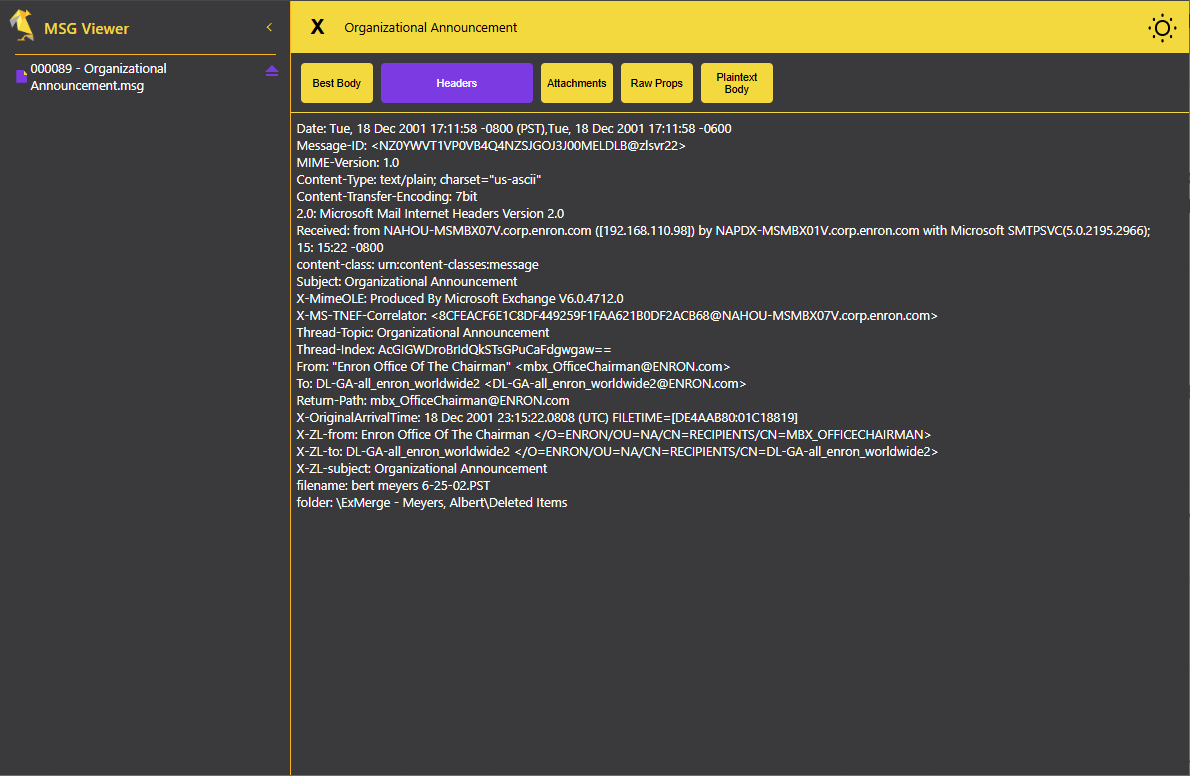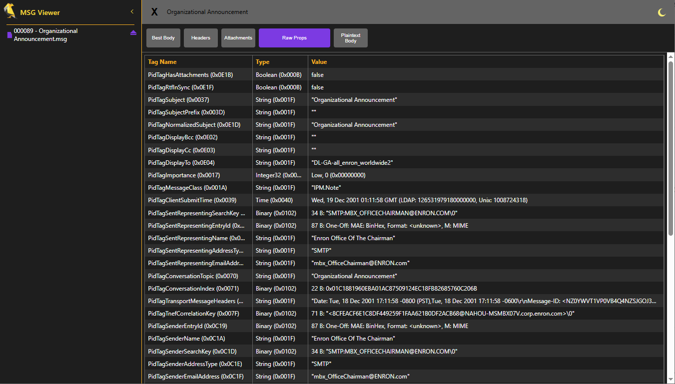 View emails, metadata, header info, raw HTML, MAPI properties, attachments and more