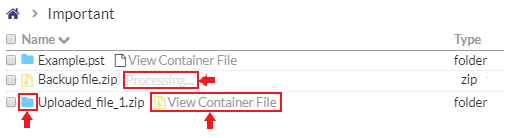 - The uploaded ZIP or PST file appears as a blue folder