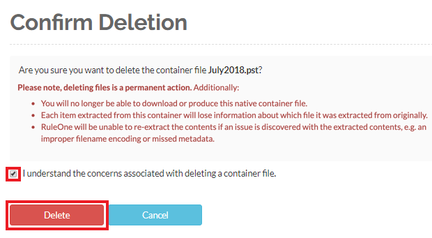 If you upload a ZIP or PST file, it is possible to delete the originally-uploaded file once the contents are extracted. To do so for individual container files, follow the steps below.