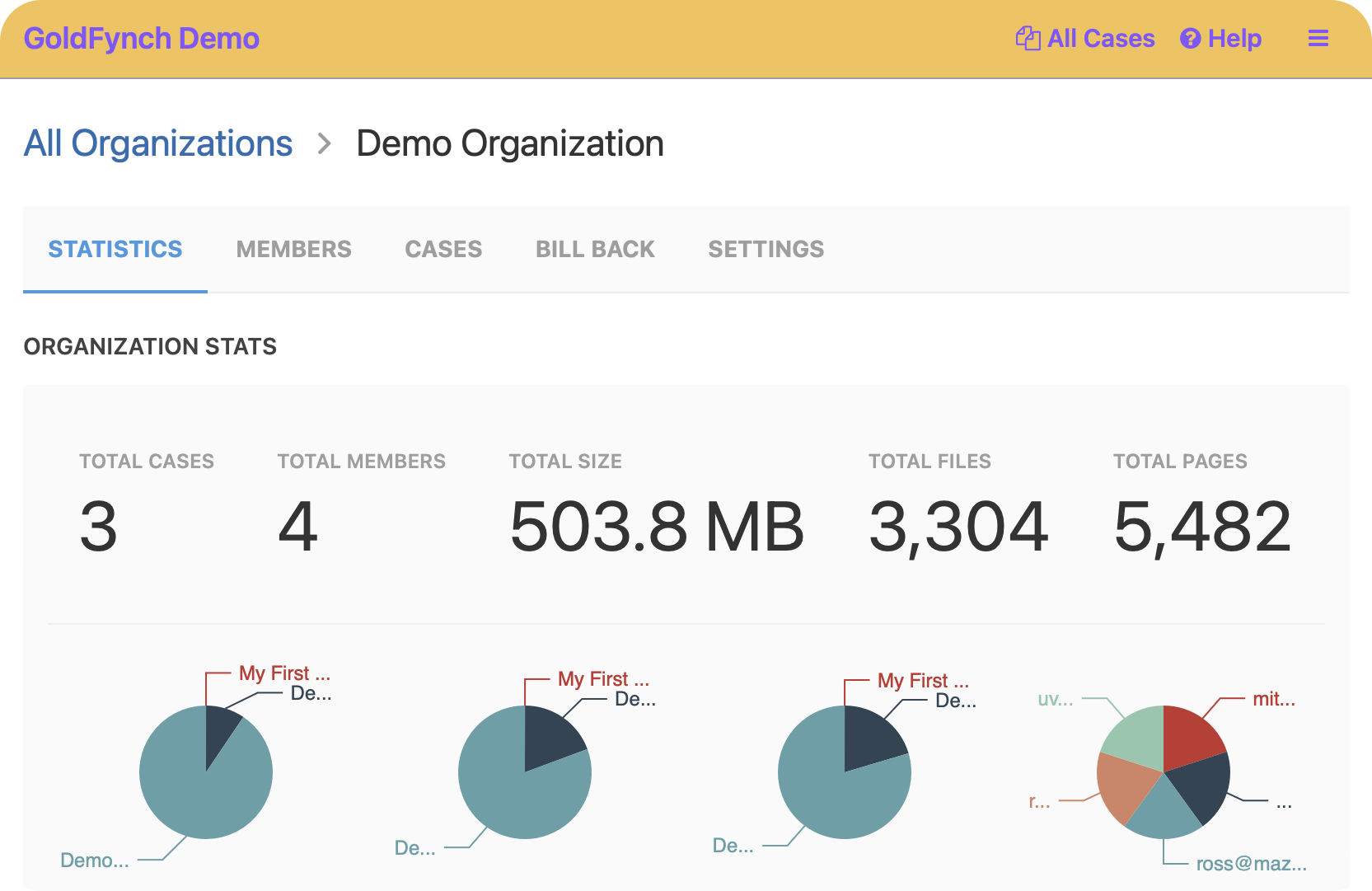 Monitor all your cases from a unified dashboard. Track statistics, users, storage, and more